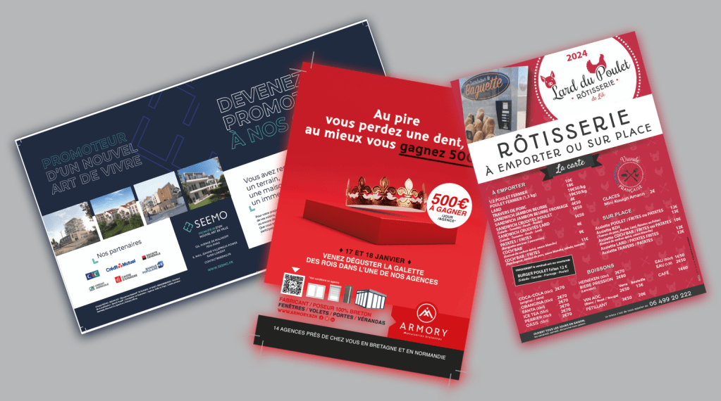 Parfaits pour les campagnes de communication locales, les lancements de produits ou les événements. Formats de A6 à A4, recto ou recto-verso, avec options de pelliculage ou vernis sélectif.
